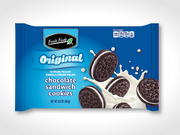 As the Fresh Finds private label brand continued to grow, opportunity arose to extend the brand into the everyday cookie category to compete with national brands. With my design I selected common color cues for instant recognition and positioned the oversize cookie as hero with the wraparound typography to grab the customer's attention.